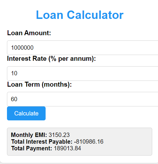 The provided code is a responsive Loan Calculator tool built using HTML, CSS, and JavaScript. Users can input the loan amount, interest rate (in percentage per annum), and loan term (in months). When the "Calculate" button is clicked, the tool uses the decimal.js library to perform precise decimal calculations and then displays the monthly EMI (Equated Monthly Installment), the total interest payable, and the total payment. The interface is designed with colorful styling and is responsive, ensuring a user-friendly experience on various devices.